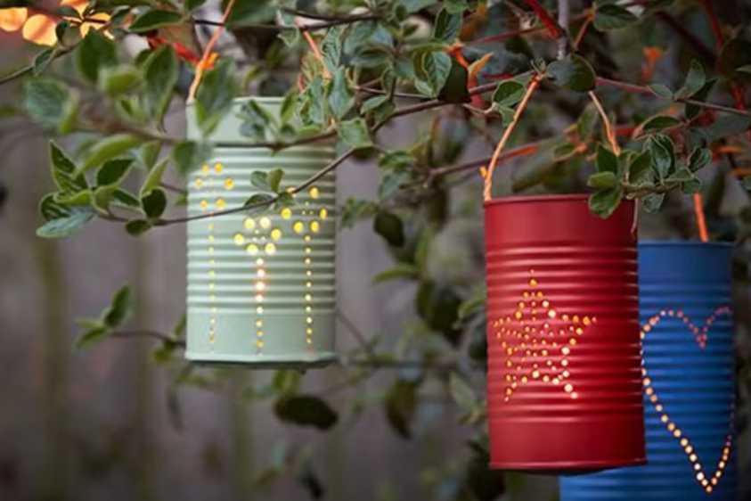 Older kids and teens can have a go at designing patterns on old tins, drilling the holes, and then painting them, to make some simple hanging candle holders.