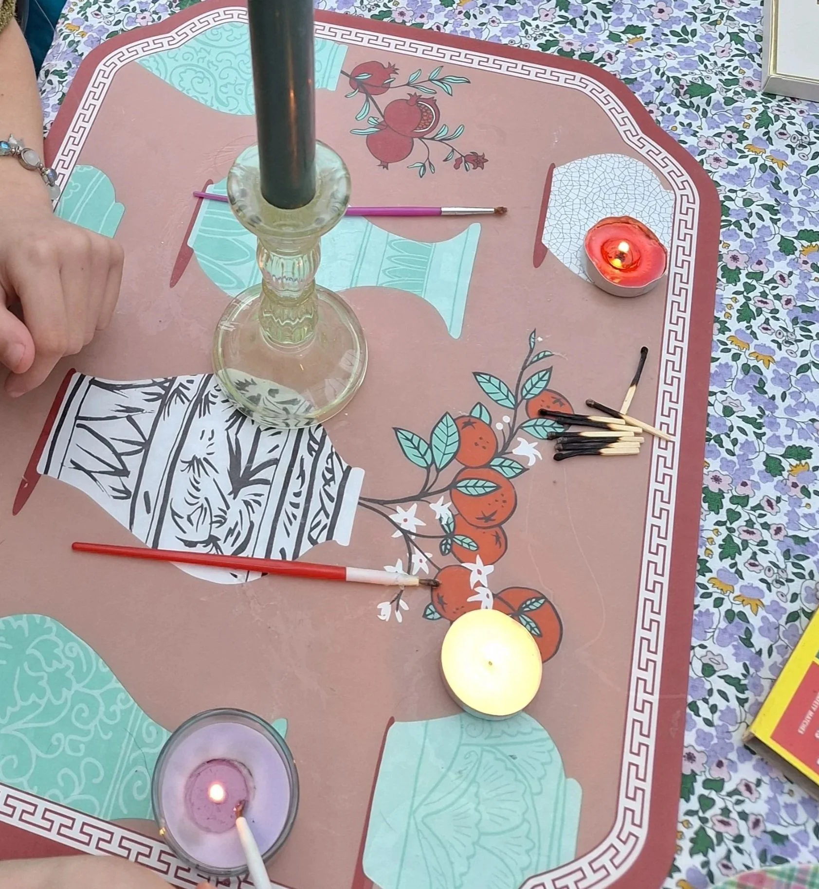 Light different coloured tea lights, and use the wax as your “paint” to decorate candles.