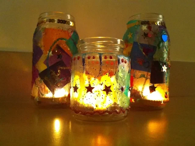 Paint or glue tissue paper onto old jam jars to make some fun and bright lanterns.